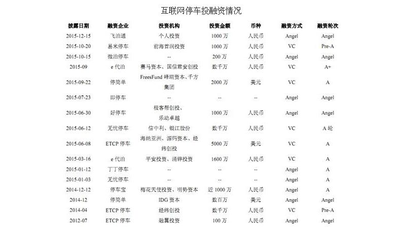 2014 年底以来,在“互联网+”的热潮下,互联网停车倍受到了资本市场的青睐,成为风投追逐的热点。几乎所有互联网停车融资项目都还处于天使轮和 A轮阶段,可见总体处于互联网化过程的早期阶段。 2015 年 6 月 12 日,无忧停车获得来自信中利和银江股份等数千万人民币的 A 轮融资;9 月 22 日,“停简单”对外宣布获得 2000 万美元 A 轮融资,由千方集团旗下投资主体领投,天使轮投资人峰瑞资本跟进;2015年 6 月 8 日,ETCP 停车获得海纳亚洲、源码资本、经纬创投 5000 万美元的联合 A轮投资,是迄今为止停车类创业公司最大规模的融资。