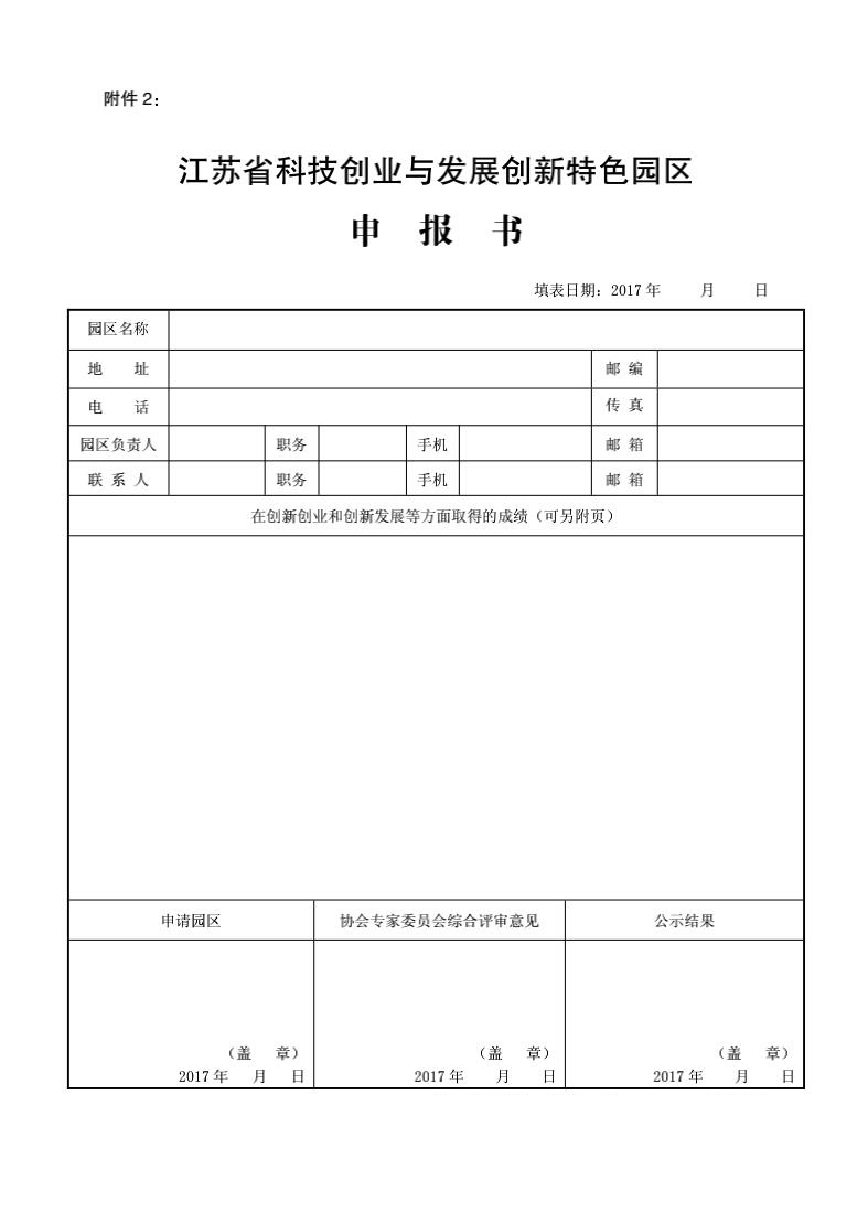 附件2:“江苏省科技创业与发展创新特色园区”申报书