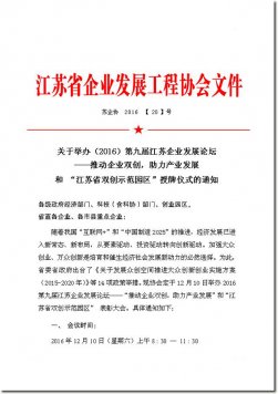 关于举办(2016)第九届江苏企业发展论坛——“推动企业双创,助力产业发展”主题征文和申报“江苏省双创示范园区”的通知全省各企业,各级开发区、创业园区:随着我国“互联网+”和“中国制造2025”的推进,经济发展已进入新常态、新布局,从要素驱动、投资驱动转向创新驱动。加强大众创业、万众创新是培育和催生经济社会发展新动力的必然选择。新一轮科技革命和产...