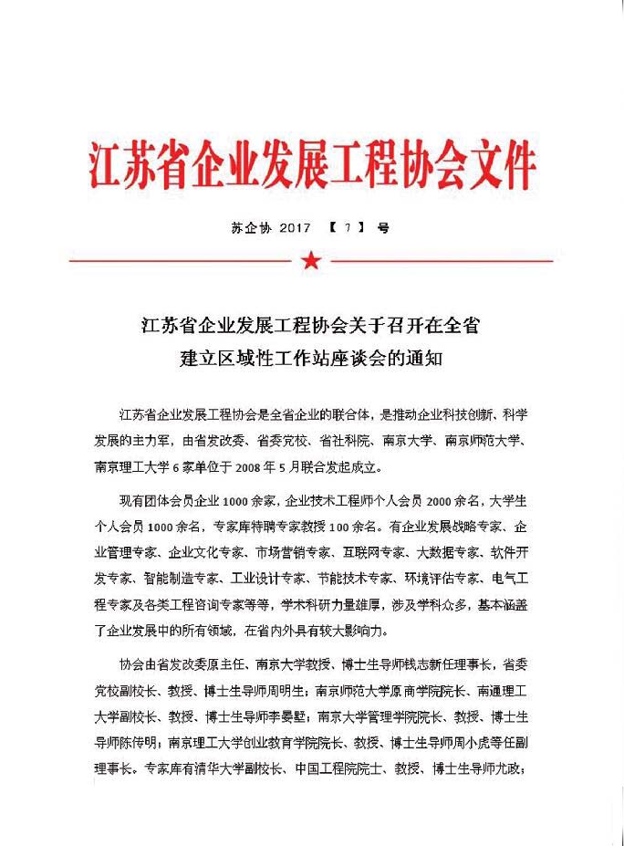 关于评选“江苏省企业投资环境最优乡镇”的通 知江苏省企业发展工程协会是全省企业的联合体,是推动江苏企业发展的主力军,由省委党校、省社科院、省发改委工程中心、南京大学、南京师范大学、南京理工大学等多家单位联合发起成立。协会在省委省政府领导下,多年来致力于推动项目交流合作,推动海内外贸易发展,推动苏南、苏中、苏北企业互动互帮互助,举办工业展...