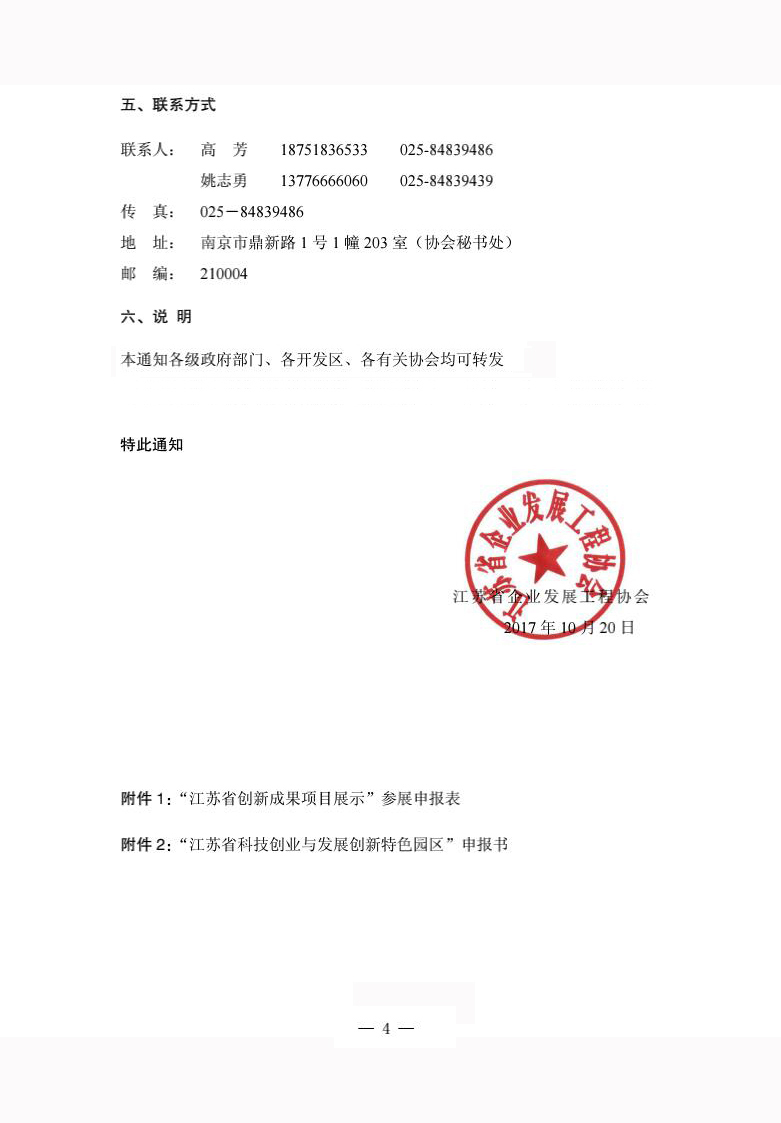 点击下载 附件1:“江苏省创新成果项目展示”参展申报表 点击下载附件2:“江苏省科技创业与发展创新特色园区”申报书...