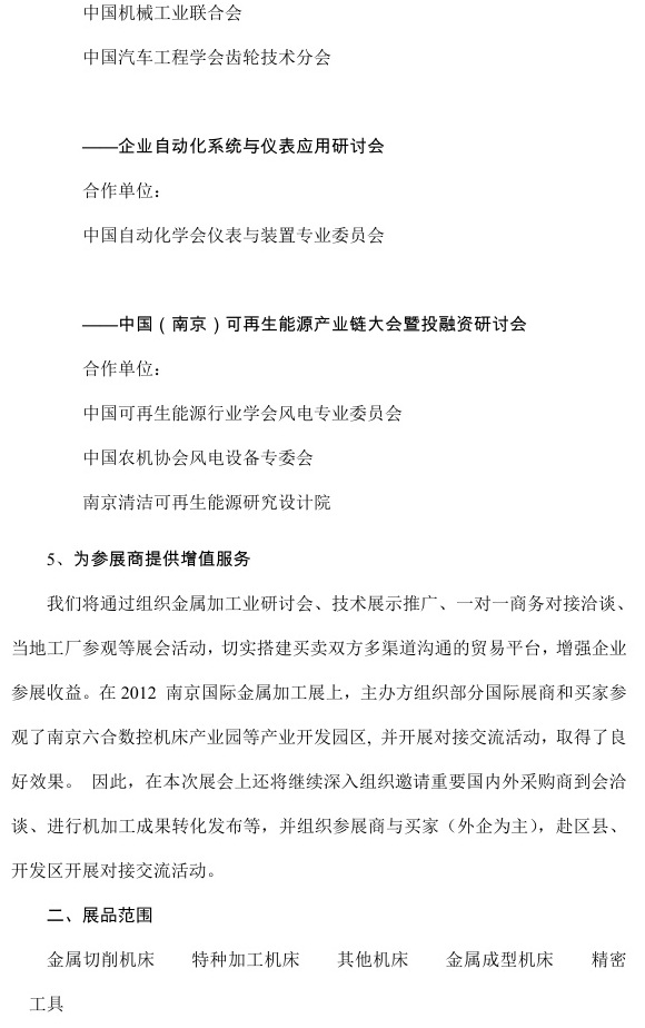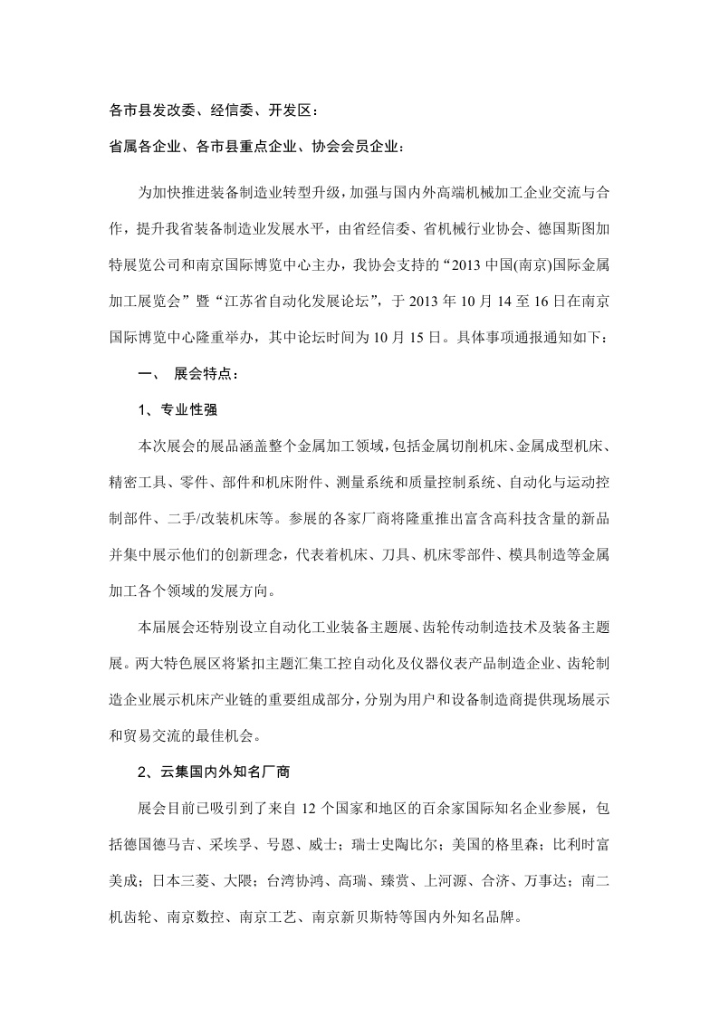 关于组织参加“2013中国(南京)国际金属加工展览会”及“江苏省自动化发展论坛”的通知各市县发改委、经信委、开发区:省属各企业、各市县重点企业、协会会员企业:为加快推进装备制造业转型升级,加强与国内外高端机械加工企业交流与合作,提升我省装备制造业发展水平,由省经信委、省机械行业协会、德国斯图加特展览公司和南京国际博览中心主办,我协会支持的“...