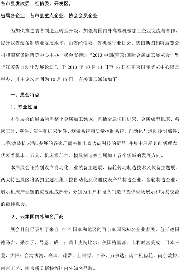 关于组织参加“2013中国(南京)国际金属加工展览会”及“江苏省自动化发展论坛”的通知各市县发改委、经信委、开发区:省属各企业、各市县重点企业、协会会员企业:为加快推进装备制造业转型升级,加强与国内外高端机械加工企业交流与合作,提升我省装备制造业发展水平,由省经信委、省机械行业协会、德国斯图加特展览公司和南京国际博......