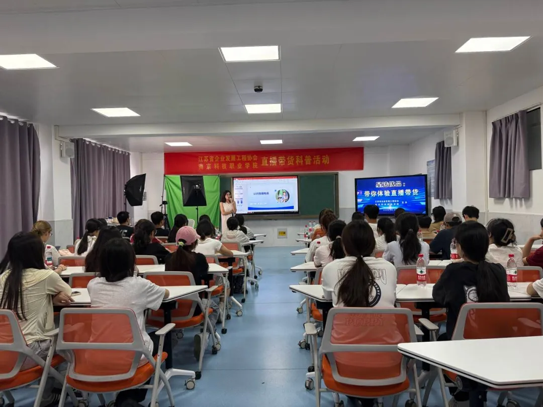 为助力青年学子紧跟数字经济发展浪潮,提升职业技能与创新思维,9月22日,江苏省企业发展工程协会联合南京科技职业学院信息工程学院在南京科技职业学院开展了一场主题鲜明、内容详实的直播带货科普活动,主题为“星选优品——带你体验直播带货”。此次活动不仅为师生们带来了前沿的直播电商知识,更彰显了协会心系教育、赋能青年成长的社会责任与担当。