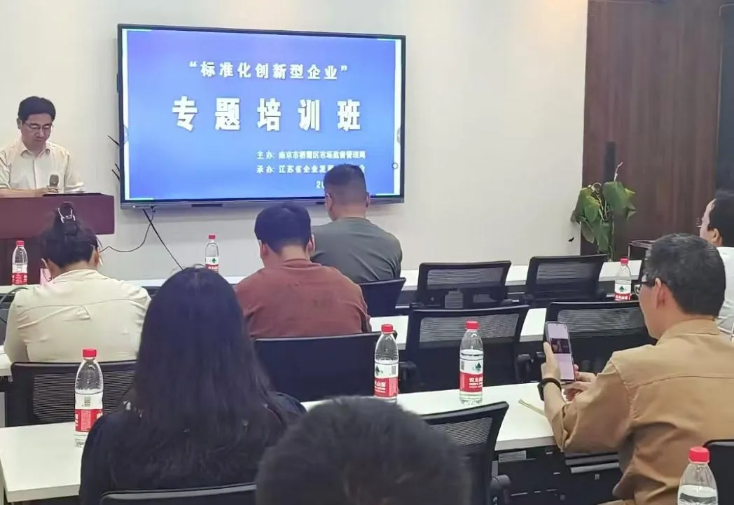 为了进一步推动企业标准化工作,提高企业在标准化领域的创新能力,8月29日,由南京市栖霞区市场监督管理局主办、江苏省企业发展工程协会承办的“标准化创新型企业”培训班在南京市栖霞区市场监督管理局综合服务中心举行。出席会议的领导和企业有:省市场监督管理局标准化处副处长揭水通、省市场监督管理局反垄断处四级调研员索忠乐、省企业发展工程协会秘书长姚志勇、南京市栖霞区市场监督管理局副局长蔡现军等,以及中建安装集团有限公司、中建八局轨道有限公司、南京港机重工制造有限公司等企业分管生产的负责人和相关部门负责人共40余人参加了线下现场培训班,线上腾讯网络会议同步进行。