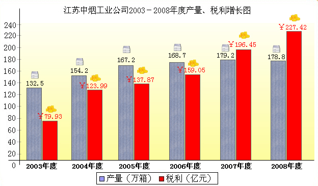 自2003年开始,江苏卷烟工业卷烟产销量连续五年平均年递增8%;创税利连续五年平均年递增25%。2008年产销卷烟178.8万箱,实现税利227.42亿元。在激烈的行业竞争中,公司“苏烟”、“南京”、“一品梅”、“红杉树”四大主导品牌进入全国卷烟百牌号目录。其中“苏烟”、“南京”被认定为“中国驰名商标”并成功跻身全国性卷烟重点骨干品牌20强。江苏卷烟产品畅销全国,并成功进入国际市场,远销加拿大、新加坡、菲律宾、比利时、泰国、澳大利亚等国家和中国香港、澳门地区。